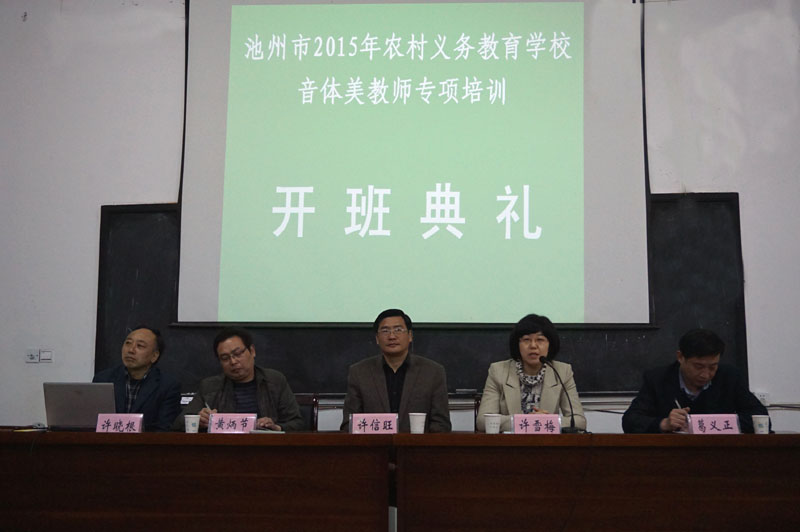 4月20日上午,池州市2015年农村义务教育学校音体美教师专项培训开班典礼在我院成教处阶梯教室举行。院党委副书记、院长许信旺,池州市教育局副局长许雪梅,池州市师资培训中心主任黄炳节以及我院成教处负责同志出席开班典礼。来自池州市农村中小学的90名音体美教师参加本次培训。